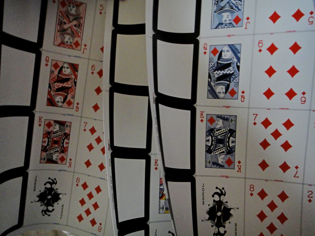 Aquí están los uncut, me ha costado hacer las fotos ya que tendían a enrollarse. La baraja limitada tiene las figuras de otro color.