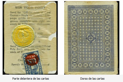 La otra es más curiosa, es un dorso genérico de USPC. Estas barajas se vendían en set de dos (azul y roja) en caja deslizante de cartón duro. Yo solo tengo la azul, sin la caja. Según el sello dorado y el timbre la baraja es del año 1940.