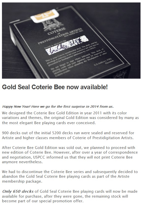 1st surprise in year 2014 from us, 650 decks of Gold Seal Coterie Bee is now available in our store.