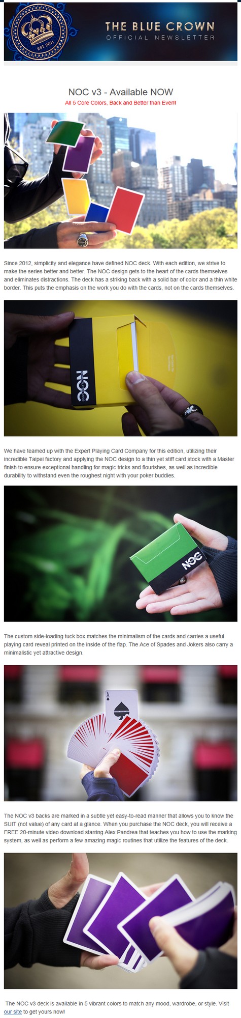 Ya están a la venta a $4.95 cada una: http://thebluecrown.com/playing-cards/noc-deck-v3.html