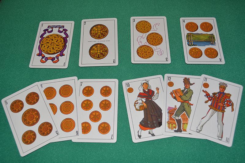 " La Baraja gallega en la que los oros están representados por motivos decorativos celtas, las copas por cuncas para beber ribeiro, las espadas por espadas celtas y los bastos por báculos o bastones de peregrino.