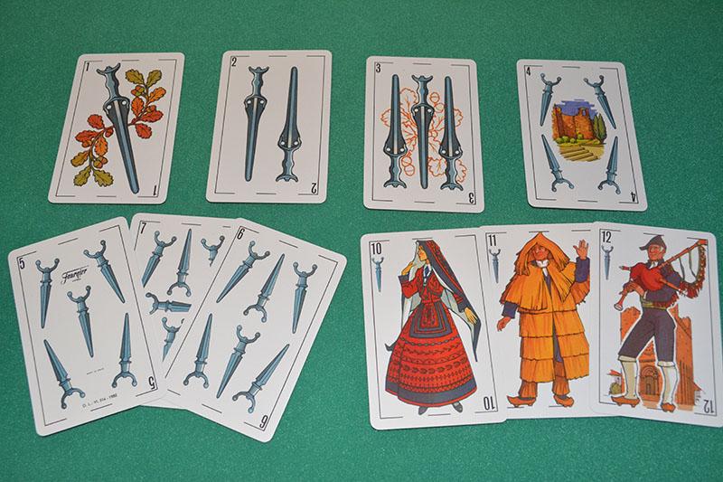 Las espadas llevan dos modelos diferentes. El as, dos y tres llevan una espada corta de combate, mientras que el resto de las cartas llevan la que era, probablemente, el arma principal de los soldados celtas. Las hojas de estas espadas estaban afiladas a ambos lados y dado el gran tamaño de la hoja era necesaria una gran empuñadura. Aprovechando el tamaño de la empuñadura se decoraba de una forma muy simbólica, ya que el mango de la espada tenía forma de ser humano: el pomo corresponde a la cabeza, el cuerpo a la empuñadura y las piernas son la guarda que sirven como protección de la mano.