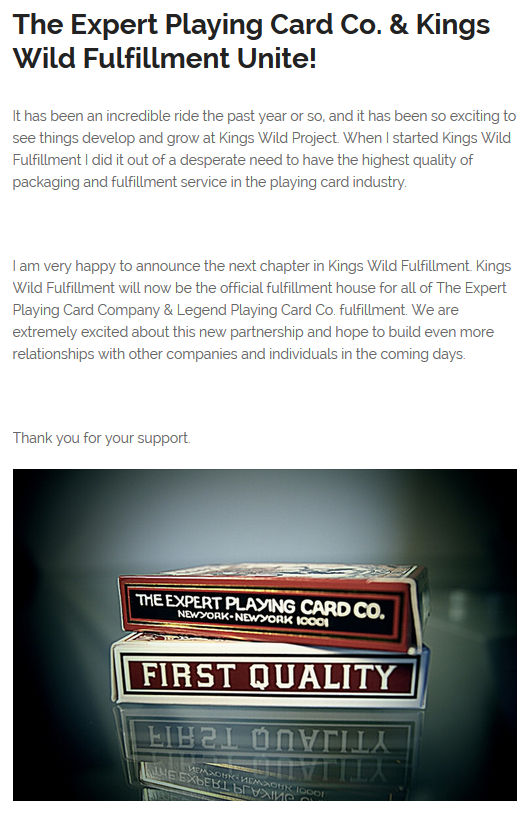 Kings Wild Fulfillment será un distribidor oficial de The Expert Playing Card Company y Legend Playing Card Co. (fuente: ir)