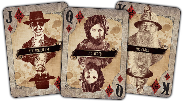 Nueva baraja bajo la marca bicycle a través de KS, con un homenaje a los bigotes, barbas y cabelleras masculinas. Dorso simétrico y bastante simplón.