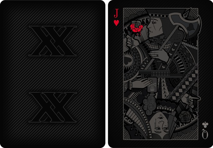 Bicycle® 'Double Black'. Baraja en escala de grises y rojo, con un dorso sencillo y caras personalizadas. Versiones con marca Bicycle y sin ella  :-\