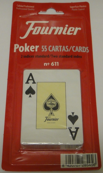 Se trata de la Fournier 611. Es una baraja de poker bastante económica, viene en presentación "blister" con todos los datos de Fournier. Pero ni en la web de Fournier hay información y ni los distribuidores oficiales tienen esta baraja. Solo la he visto por ebay y en los establecimientos regentados por Chinos.