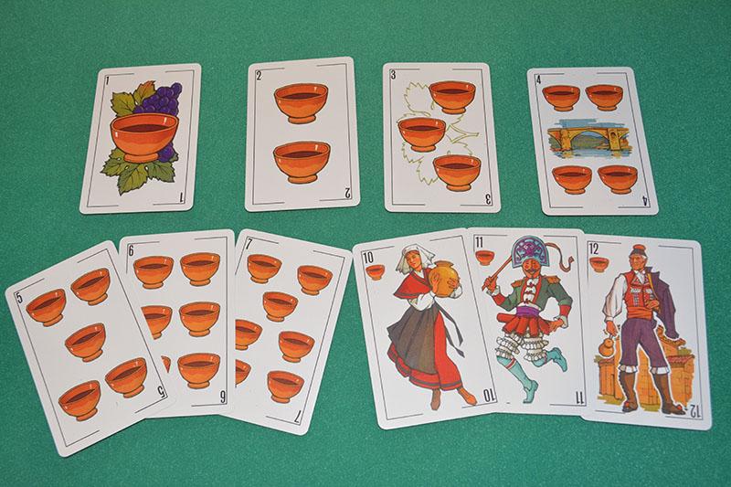 En el palo de las cuncas aparecen en el as y en el tres referencias al vino, mediante hojas de viñas y uvas.