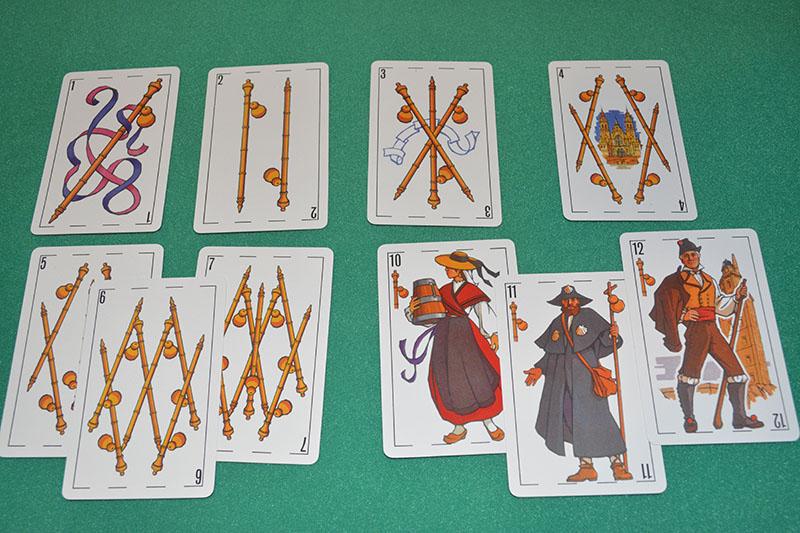 " La Baraja gallega en la que los oros están representados por motivos decorativos celtas, las copas por cuncas para beber ribeiro, las espadas por espadas celtas y los bastos por báculos o bastones de peregrino.