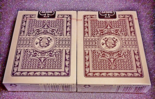 No sé si alguien más por aquí las tiene, pero las caras, puntos y figuras son iguales que los de una Bicycle clásica, excepto por los colores: el rojo se ha sustituído por granate, entiendo que en el modelo púrpura también tiene el mismo cambio (no tengo ninguna abierta).